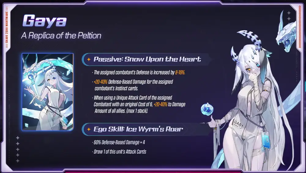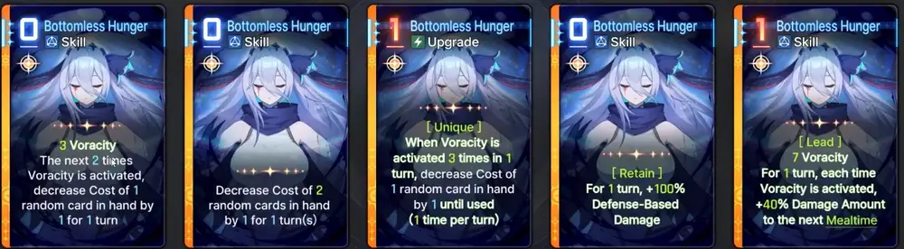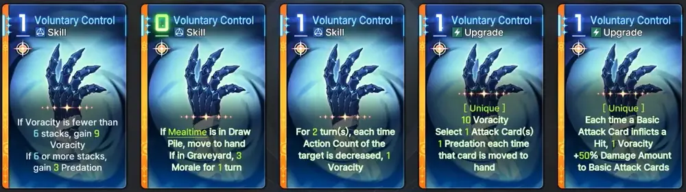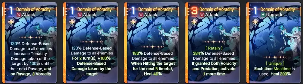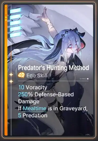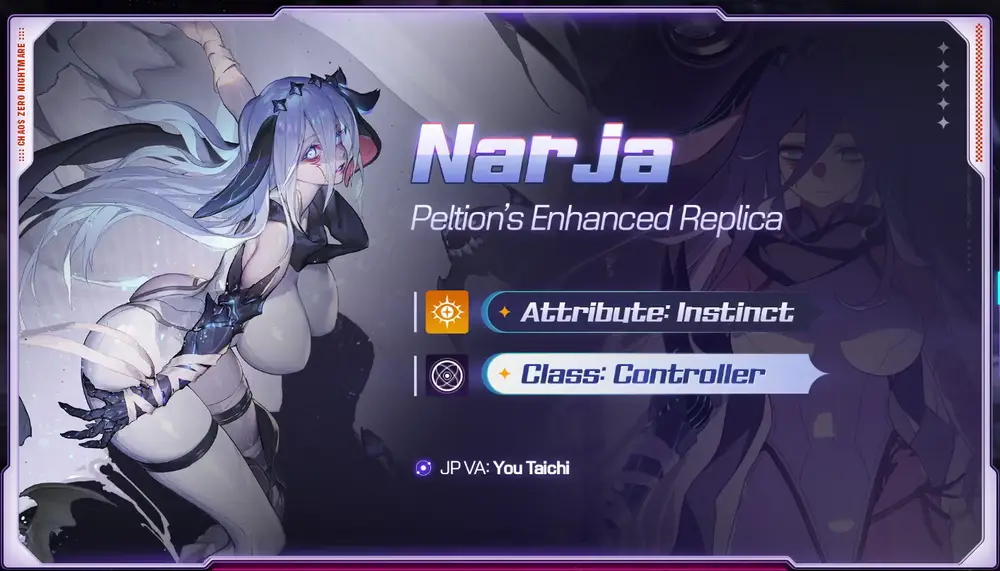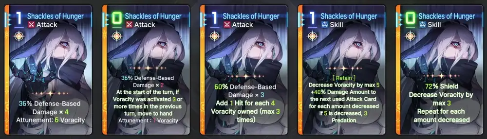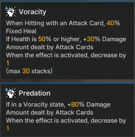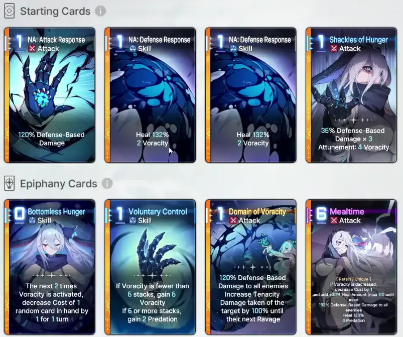 Narja is an Instinct Controller who specialize in healing and increasing the damage of attack cards through stacking Voracity and Predation. She deals Defense-Based damage and can heal everytime an ally uses an attack card. Here is the tooltip: